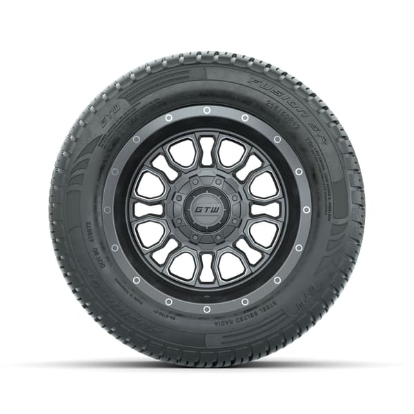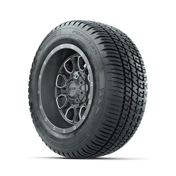 A set of (4) 12-inch GTW® Volt Gunmetal with Machined Accents golf cart wheels on 215/50-R12 GTW® Fusion S/R Steel Belted Street Tires