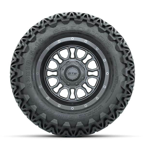A set of (4) 12-inch GTW® Volt Gunmetal with Machined Accents golf cart wheels on 23×10.5-12 GTW® Predator All-Terrain Tires