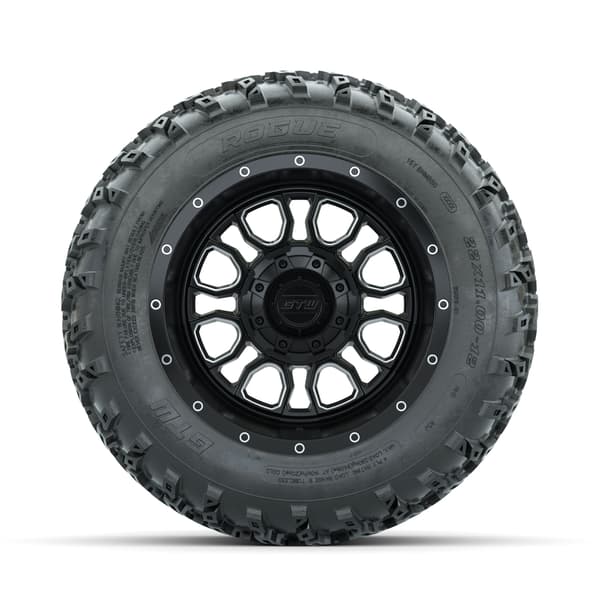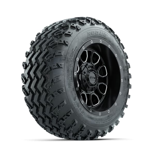A set of (4) 12-inch GTW® Volt Machined/Black golf cart wheels Mounted on 22×11.00-12 Rogue All-Terrain Tires