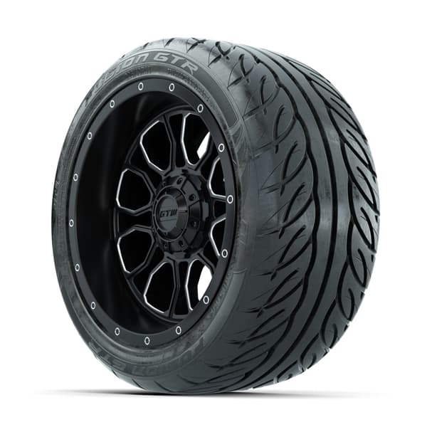 A set of (4) 14-inch GTW® Volt Machined/Black golf cart wheels Mounted on 225/40-R14 GTW® Fusion GTR Steel Belted Street Tires