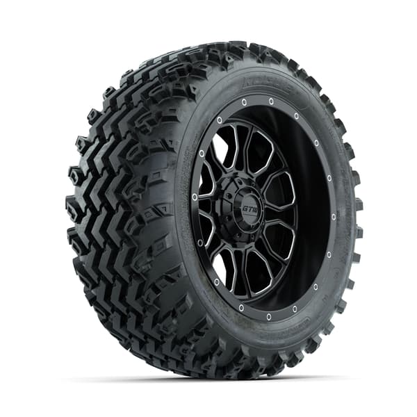 A set of (4) 14-inch GTW® Volt Machined/Black golf cart wheels Mounted on 23×10.00-14 Rogue All-Terrain Tires