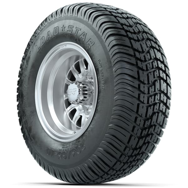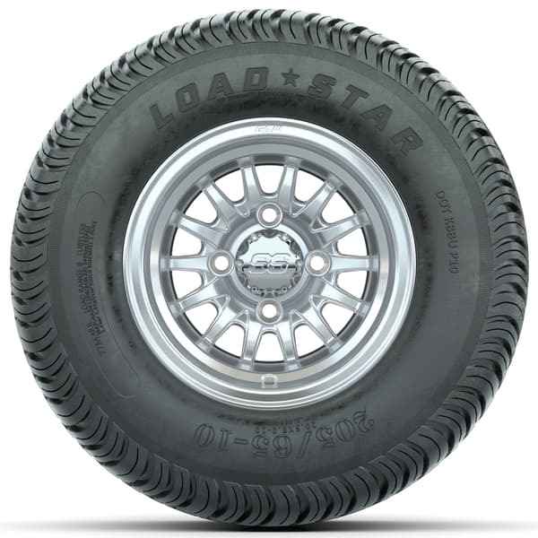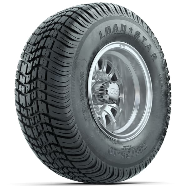 Set of (4) 10″ GTW Medusa Wheels with 205/65-10 Kenda Load Star Tires features 20” tall 4-ply tires pre-mounted on machined silver 10×7 wheels. Ideal for street, turf, or course use with a 4×101.6mm lug pattern. No lift kit required. Center caps included; lug nuts sold separately.