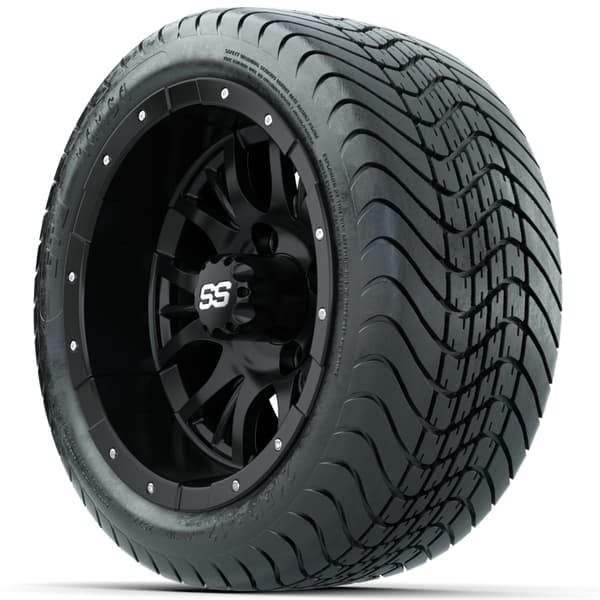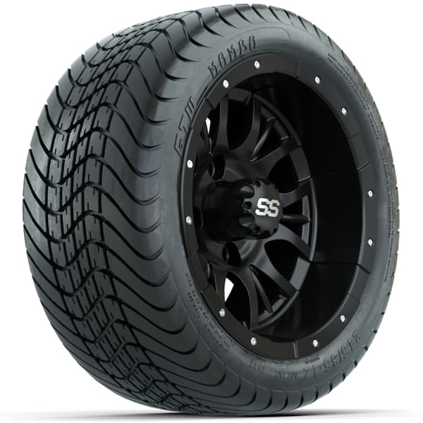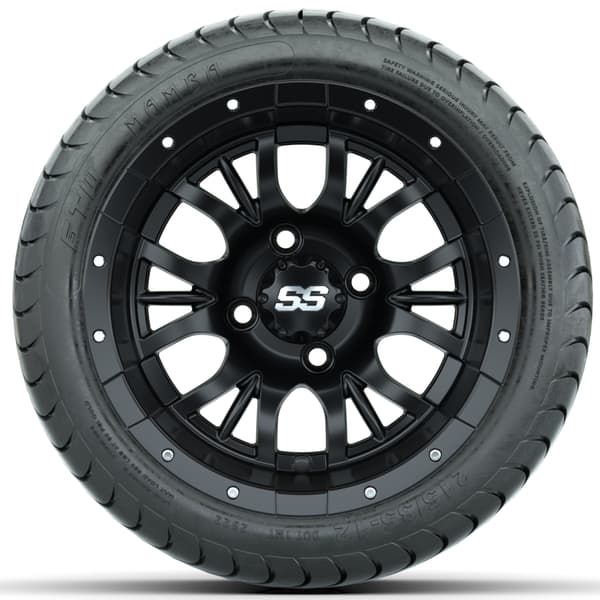 Set of (4) 12″ GTW Diesel Wheels with 215/35-12 GTW Mamba Street Tires includes 18” tall 4-ply tires and matte black 12×7 wheels. Pre-mounted with 4×101.6mm lug pattern for street, turf, or course use. No lift kit needed on most carts. Center caps included; lug nuts sold separately.