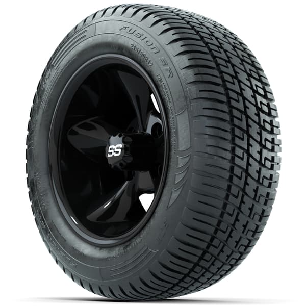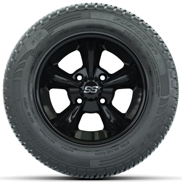 Set of (4) 12″ GTW Godfather Wheels with 215/50-R12 Fusion S/R Street Tires. Black finish, pre-mounted for street, turf, or course use. No lift kit required for most carts. Features 4×101.6mm lug pattern. Lug nuts sold separately.