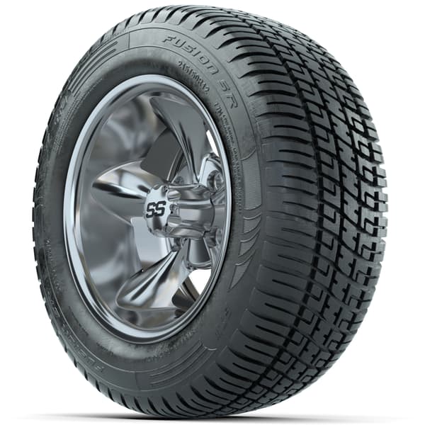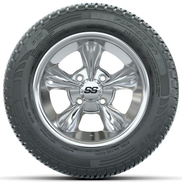 Set of (4) 12″ GTW Godfather Wheels with 215/50-R12 Fusion S/R Street Tires. Machined and black finish with 20″ tall tires, pre-mounted for street, turf, or course use. No lift kit required for most carts. 4×101.6mm lug pattern. Lug nuts sold separately.