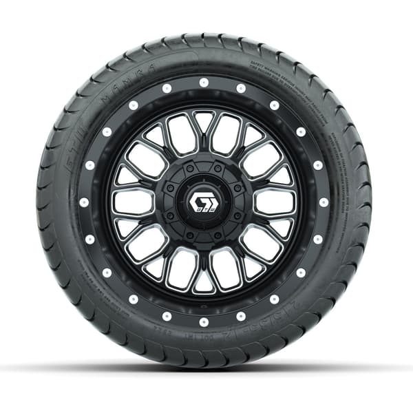 A set of (4) 12-inch GTW® Helix machined face with black golf cart wheels on 215/35-12 (18-Inch) GTW® Mamba Street Tires