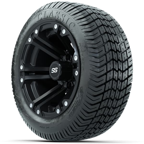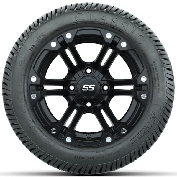 Set of (4) 12″ GTW Specter Wheels with 215/40-12 Excel Classic Street Tires. Matte black finish with 18″ low-profile tires, pre-mounted for street, turf, or course use. No lift kit required for most carts. 4×101.6mm lug pattern. Lug nuts sold separately.