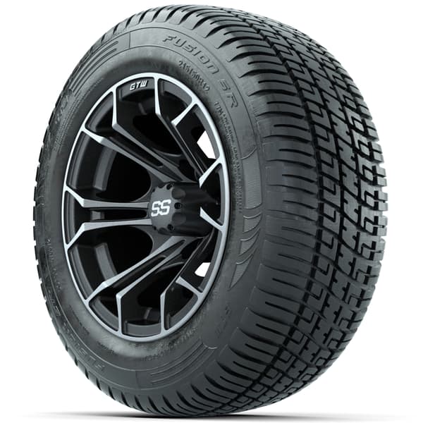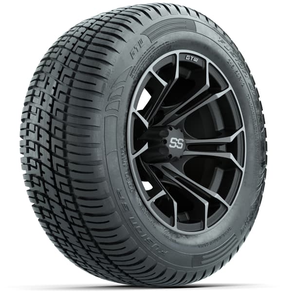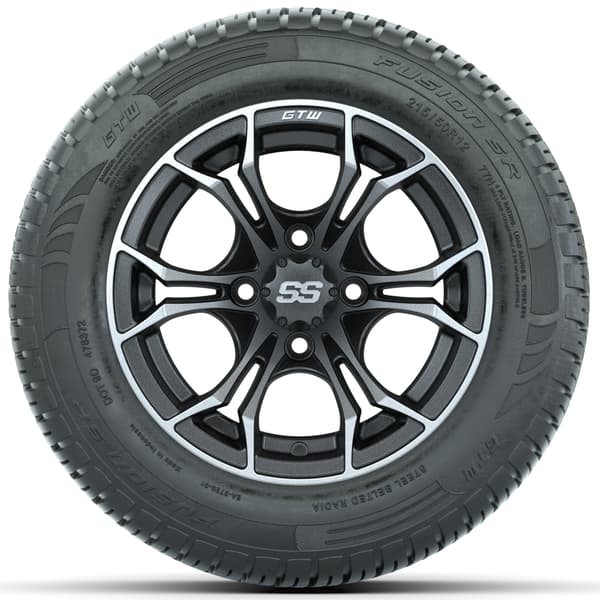 Set of (4) 12″ GTW Spyder Wheels with 215/50-R12 Fusion S/R Street Tires. Matte machined and gray finish, pre-mounted for street, turf, or course use. No lift kit required for most carts. Features 4×101.6mm lug pattern. Lug nuts sold separately.