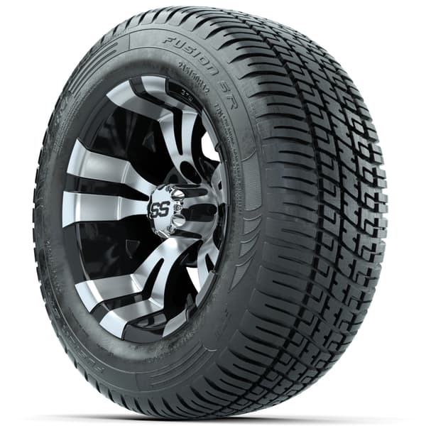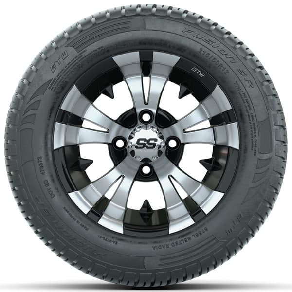 Set of (4) 12″ GTW Vampire Wheels with 215/50-R12 Fusion S/R Tires includes 20” tall street/turf-ready tires, machined and black 12×7 wheels, and center caps. Pre-mounted and inflated with 4×101.6mm lug pattern. No lift kit required for most carts. Lug nuts sold separately.