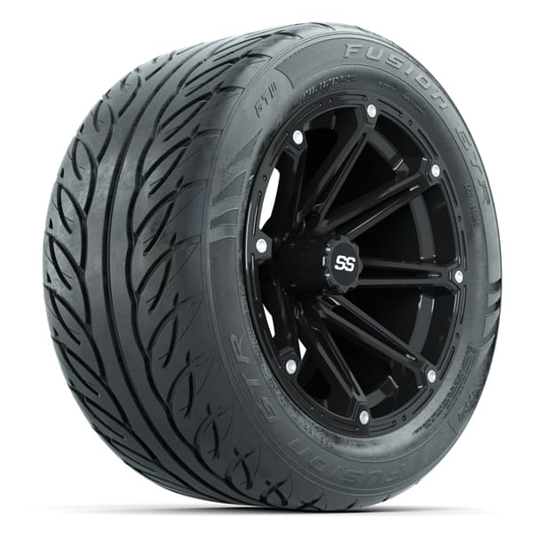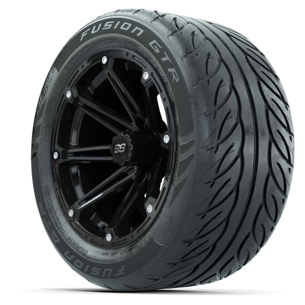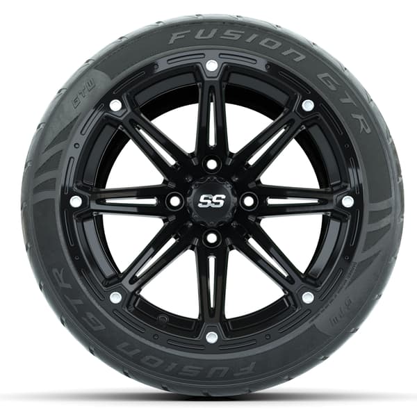 Set of (4) 14″ GTW Element Wheels with 255/45-R14 Fusion GTR Street Tires includes 23” tall 4-ply tires and black 14×7 wheels with 4×101.6mm lug pattern. Pre-mounted and inflated for street, turf, or course use. Lift kit required. Center caps included; lug nuts sold separately.
