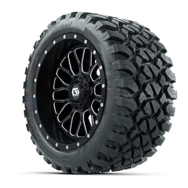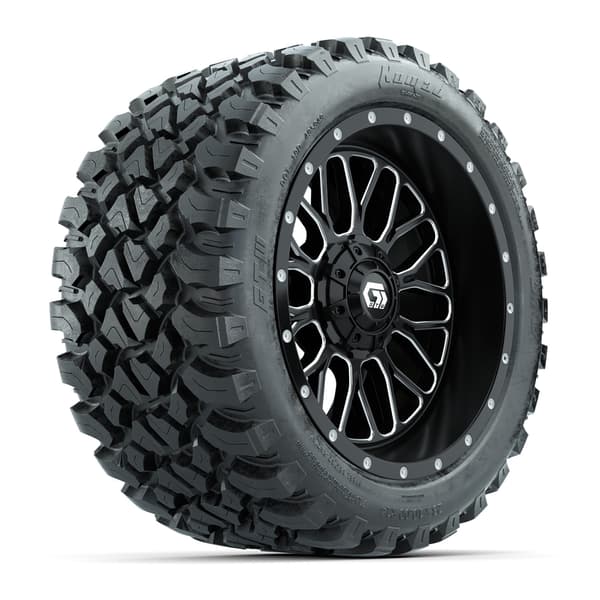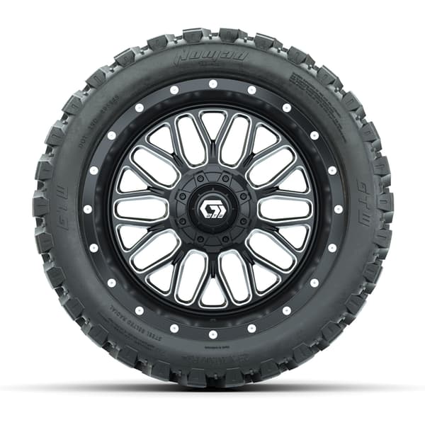 A set of (4) 14-inch GTW® Helix machined face with black golf cart wheels on 23×10-R14 GTW® Nomad All-Terrain Tires