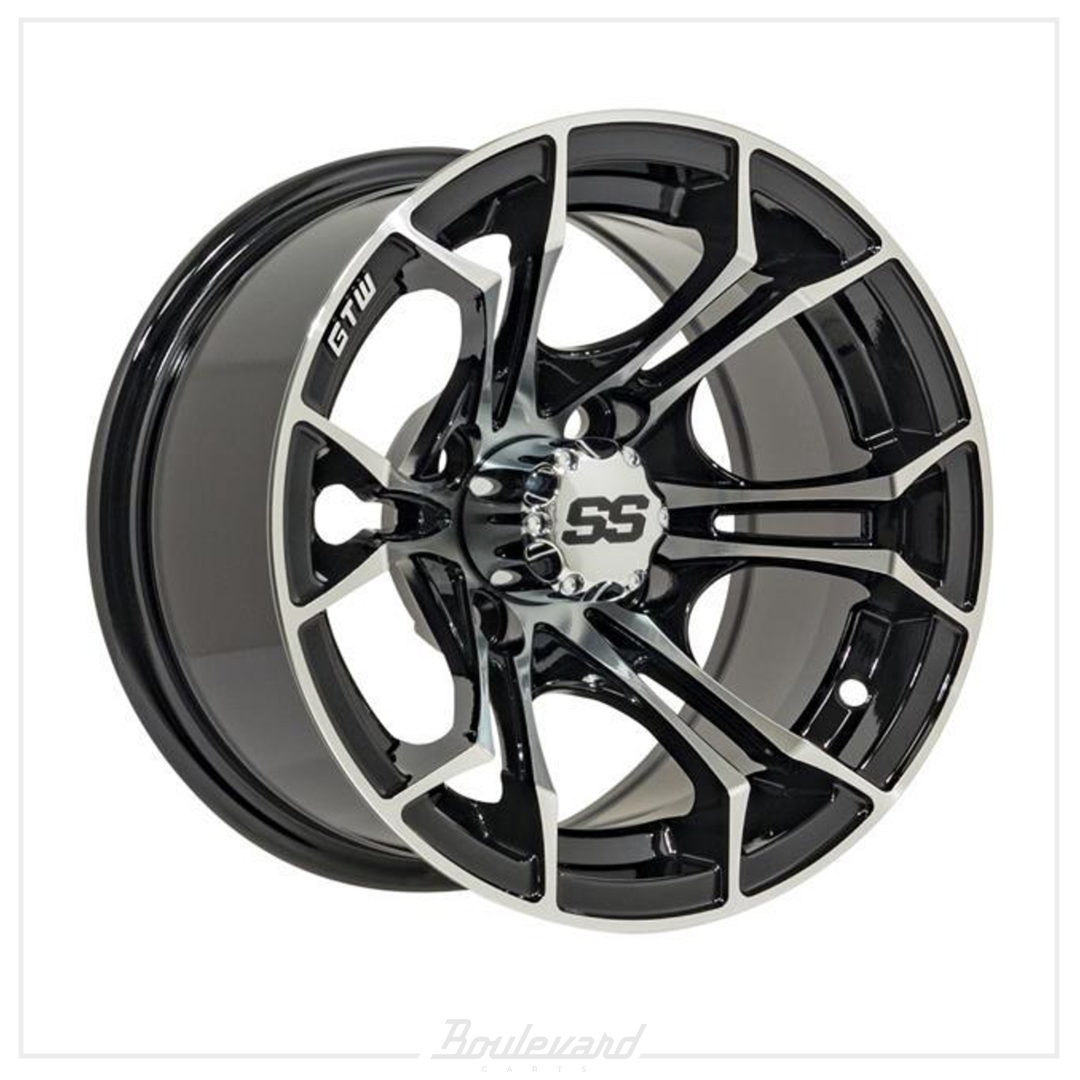 The latest Spyder wheel in the GTW® line can be clearly distinguished from the many other golf car wheels on the market. The Spyder is a GTW® Exclusive design and features a sharp Y-spoke design with red, blue or machined accents, striking sharp angles, deep concave profile, and dynamically-chamfered outer edge.