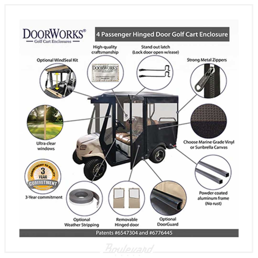 DoorWorks enclosures are a patented golf cart enclosure with innovative hinged doors. These doors can be secured open, closed or taken off all together.