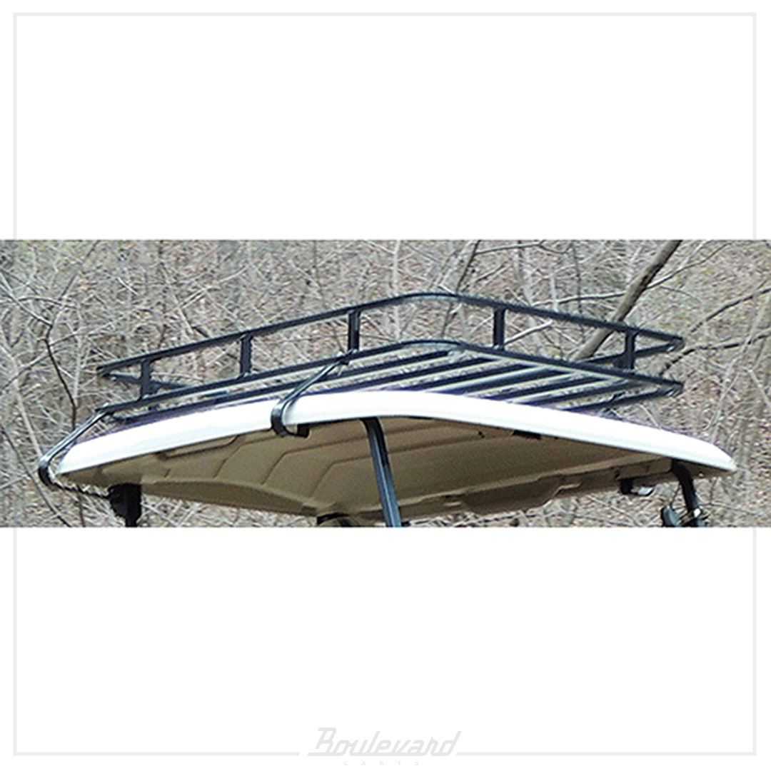 The only roof rack storage system of its kind on the market. Great for hunting, storage, hauling, luggage and more. Fits Club Car Precedent. Heavy duty black powder coated steel construction. Rack measures 5″H x 32″W x 52″L. Easy to install with custom brackets designed for each roof style. Includes roof rack, installation hardware and mounting brackets. Some drilling required.